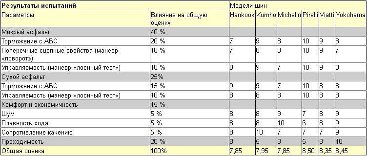 Примечание. Большинство покрышек имело маркировку «M+S», что говорит о возможности их круглогодичного использования. Однако мы намеренно не проводили испытания на зимних покрытиях, так как считаем, что для большинства российских регионов лучше подойдут специализированные зимние шины