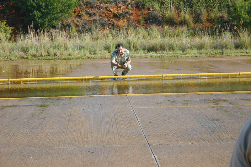 Теперь — тесты на аквапланирование в повороте. Короткий сектор замкнутой асфальтовой трассы (круг диаметром 200 м) представляет собой «ванну» с водой глубиной около 10 мм. Водитель наматывает круги, каждый раз увеличивая скорость на 1 км/ч, и фиксирует момент, когда автомобиль начинает уплывать с заданной поворотом руля траектории. После этого он продолжает увеличивать скорость — до тех пор, пока автомобиль не выскользнет за пределы размеченного коридора. Это и есть предельная скорость выполнения маневра.