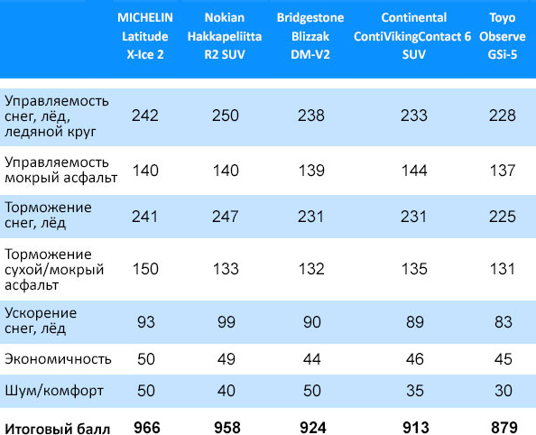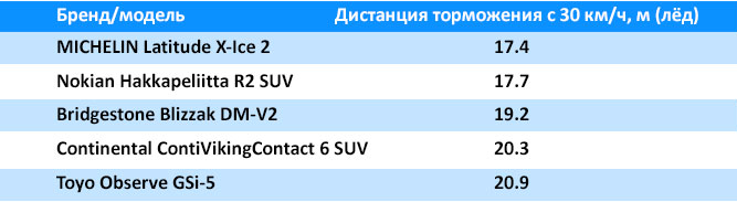 В первую очередь эксперты из казахского издания kolesa.kz решили проверить важнейшую характеристику зимних покрышек - эффективность торможения в условиях гололедицы. Безусловным победителем в этой "номинации" стала шина Michelin Latitude X-Ice 2, следом за ней в рейтинге расположилась модель Hakkapeliitta R2 SUV. Наихудший результат продемонстрировала автошина Toyo Observe GSi-5, для которой протяженность тормозного пути была на 3.5 м больше в сравнении с лидером.