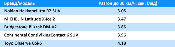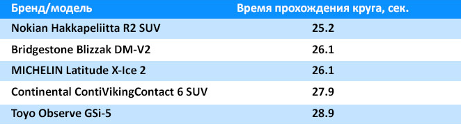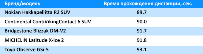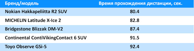 Следующее испытание было направлено на проверку разгонной динамики покрышек. Как и в предыдущих двух проверках, лидером оказалась модель Hakkapeliitta R2 SUV, с которой автомобиль разгонялся от 5 до 30 км/час всего за 3.05 секунды. Худший результат продемонстрировала покрышка Тойо, для которой этот параметр оказался на 1.13 с больше.