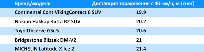 Особое внимание специалисты уделили тормозным качествам покрышек на заснеженной дороге. В этом испытании лидером стала шина Континентал, которая в предыдущих проверках занимала средние позиции в рейтингах. Покрышка Нокиан, победившая сразу в трех предыдущих испытаниях, здесь заняла второе место.