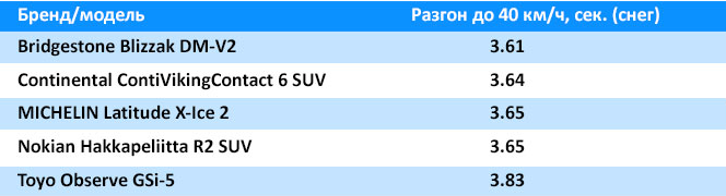 Следующая проверка позволила японским шинам Бриджстоун продемонстрировать свою сильную сторону - разгонную динамику на снегу. На разгон до 40 км/час этим покрышкам потребовалось на 0.22 секунды меньше, чем шинам Тойо, занявшим пятое место в рейтинге.