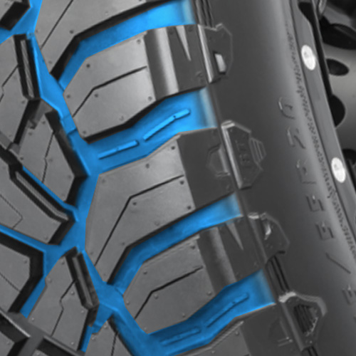 В конструкции покрышки используется запатентованная резиновая смесь, которая не только продлевает срок службы протектора, но и плавно переходит в боковину, усиливая ее и придавая выразительный внедорожный стиль. Это решение позволяет сохранять эстетическую привлекательность даже после длительной эксплуатации и делает продукт неотъемлемым элементом для тех, кто хочет подчеркнуть характер своего пикапа, внедорожника или легкого грузовика.